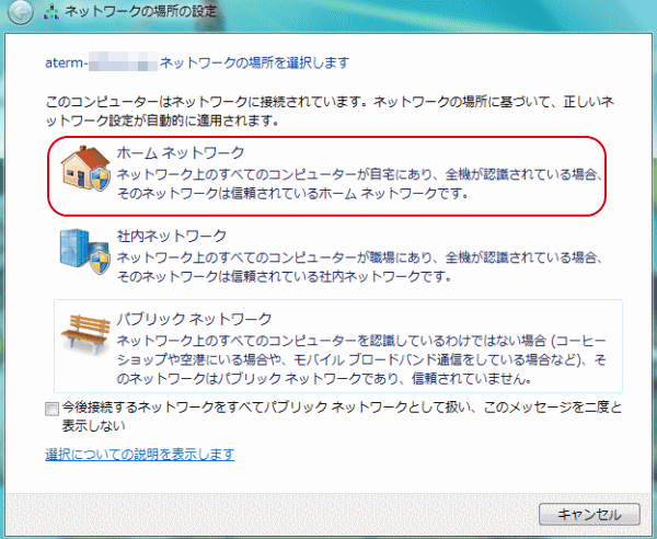 次の画面を表示するので、家庭内の場合は「ホーム ネットワーク」事務所内の場合は「社内ネットワーク」、外部(モバイル接続など)の場合は「パブリック ネットワーク」をクリックします。